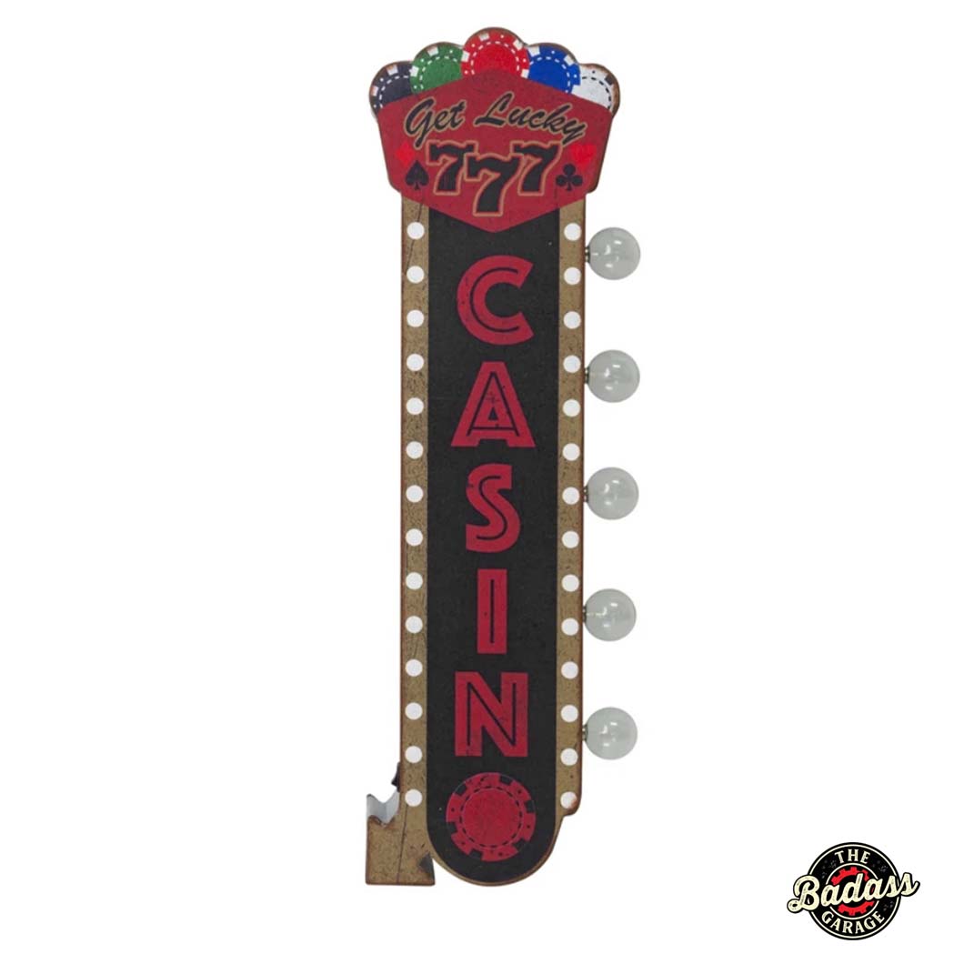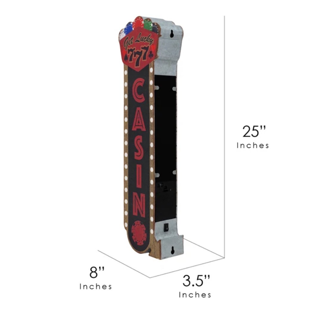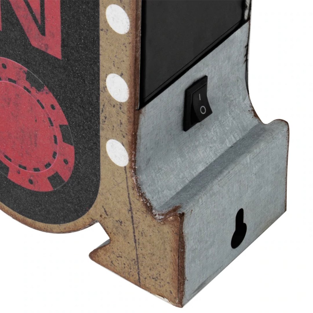 Made from galvanized metal with the words ""get lucky"" and ""casino"" in bold red lettering against a black background, this cool piece of wall decor possesses all the hallmarks of classic vintage-style signs and combines them with modern energy-efficient LED lights.
