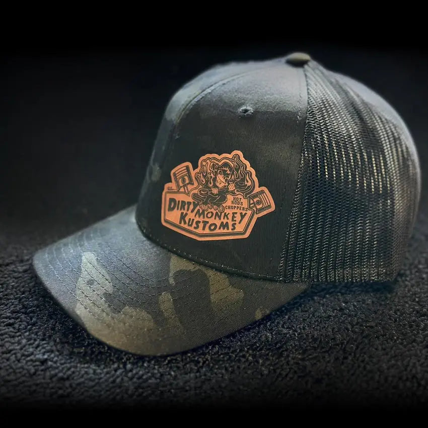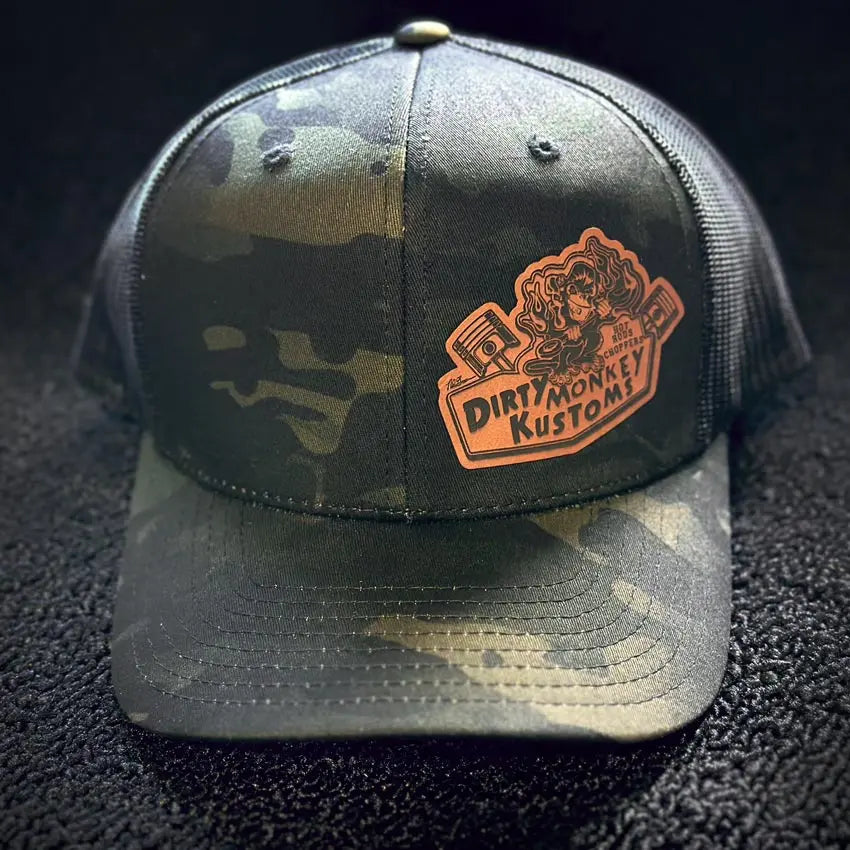 This is a Camo color front & black mesh back classic trucker hat with the original Dirty Monkey Kustoms leather patch logo.